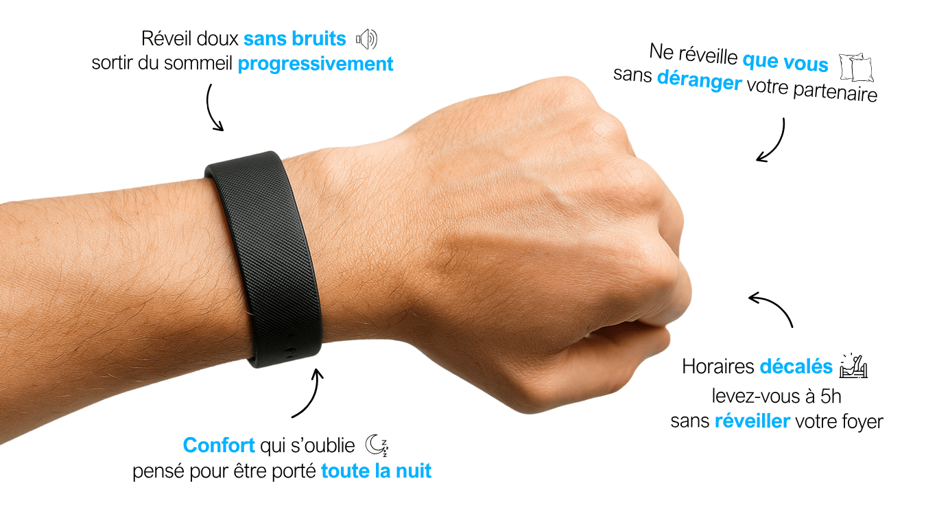 Il se porte au poignet comme un bracelet. À l’heure programmée, il vibre doucement jusqu’à ce que vous soyez réveillé, sans sonnerie agressive ni bruit dans la pièce.